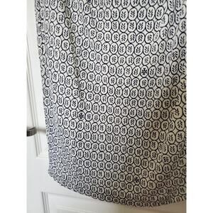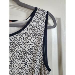Style: Classy sleeveless sheath dress. Scoop neckline and navy blue accented neckline and sleeves. Fully lined. Ruched gathering at left hip for flattering fit. Tory Burch logo scattered throughout the pattern. 100% Rayon with polyester lining. Dry Clean only. Length is midi, a few inches below the knees. Stretchy material.