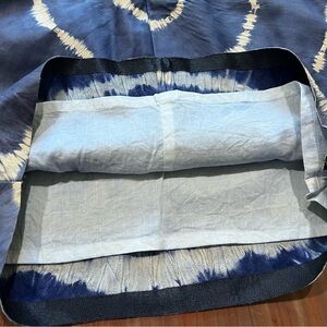 Stylish Tory Burch piece with a blue and cream tie-dye pattern. Features a zip closure and signature logo tag. Pockets on both sides. In excellent condition.