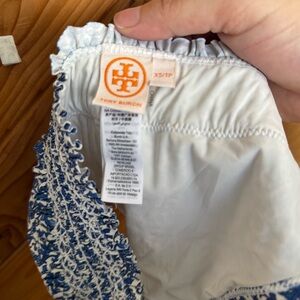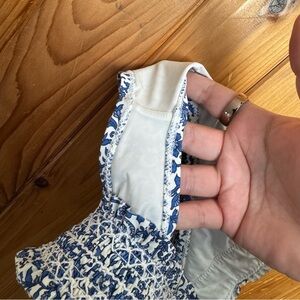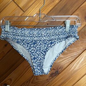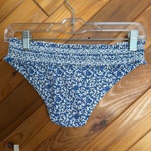 Stylish bikini bottom with blue and white pattern. Comfortable fit. Perfect for beach days.