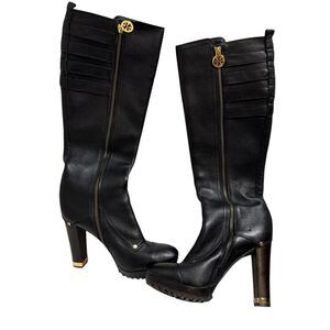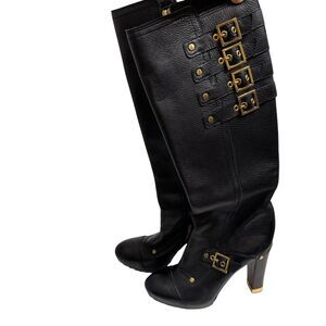 Tory Burch Boots Womens Size 9.5 Black Leather Tall Knee High Gold Buckle 1783