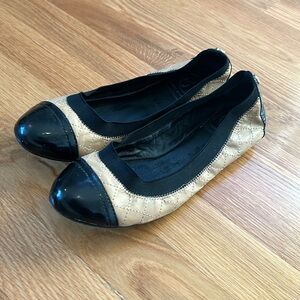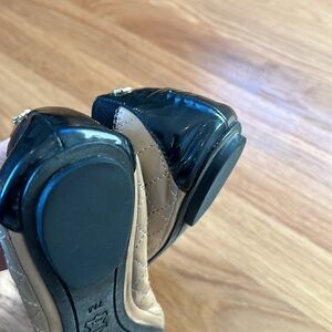 Tory Burch Bridgette ballet soft patent calf leather honey wheat/black. Come without the original box. Preloved with normal signs of wear as seen in pictures