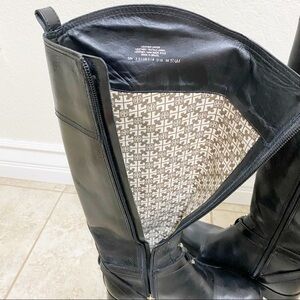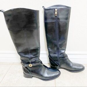 DETAILS & CARE An asymmetrical shaft elevates a lightly textured riding boot punctuated with logo hardware. 1 1/4" heel (size 9). 17 1/4" outside boot shaft; 15" calf circumference. Side zip closure. Leather upper/leather and cotton lining/leather and rubber sole.