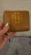 Stylish tan leather wallet featuring a gold logo. Compact and elegant design.