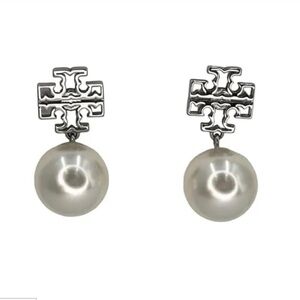 Tory Burch Britten Small Pearl Drop Earring White Gold Plated New