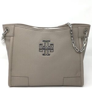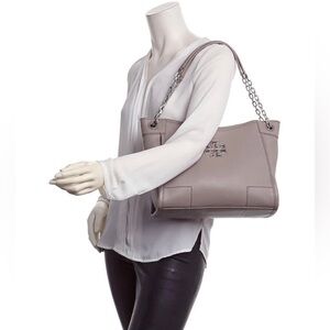Tory Burch Britten slouchy tote Crossbody bag satchel purse leather taupe gray with silver accents adjustable shoulder hand straps signature double T medallion featured in the center. Zip through center compartment divides the interior. Logo shred lining one zip pocket. Bottom approx 11.5 inches long. approx 9 1/2 inches tall approx 4.7 wide. Shoulder strap drop doubled and shortened approx 9 inches strap fully extended approx 15 1/2 inches. I believe this is the French gray pebble leather. Slouch shoulder bag. Elevate your style with this high-quality medium size tote featuring a sleek and stylish design with silver tone, hardware accents, and a iconic Tory Burch logo. a magnetic outer closure for your convenience and a leather strap with silver accent chain strap Luxury item. Minimalist design spacious interior for business and casual outings ensuring you stay organized and stylish.
