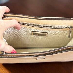 Chic Tory Burch crossbody in beige. Features silver chain and logo details.