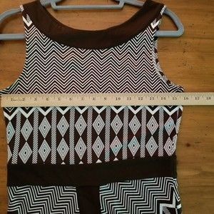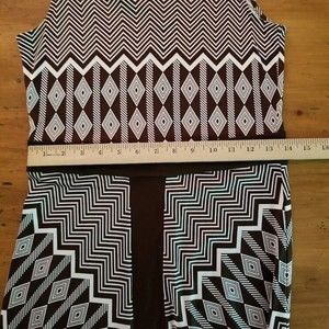 Features: Tory Burch TB Logo Zipper, Flattering Slimming Art Deco Geometric design pattern in diamond and zig zag pattern with dark brown rounded neckline and waist band in the same dark brown that extends down the front of the dress. Lovely knee length modest dress.
