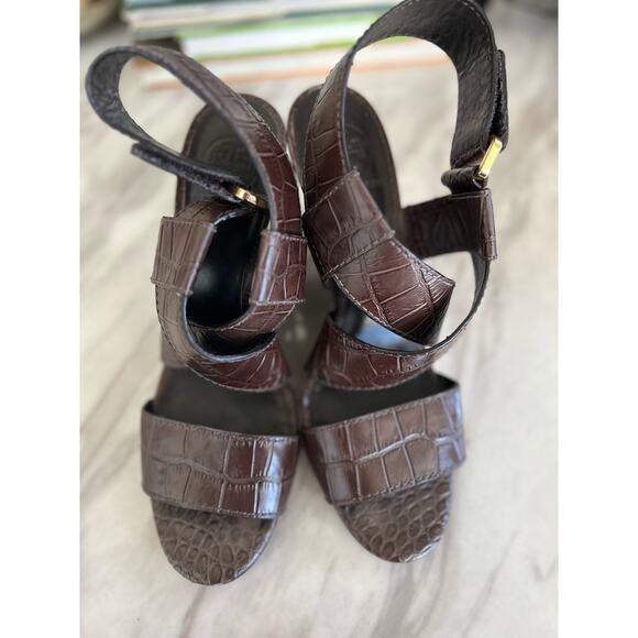 Tory Burch Brown Croc Embossed Wedge Chunky Strap Sandal