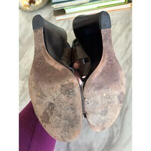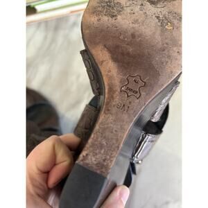Good condition, small knick at toe as show (photo 4) and wear to sole). Uppers look great. Brown croc embossed leather with a chunky gold buckle slide through latch. Chunky criss cross straps across the ankle. Stacked brown wedge heel.