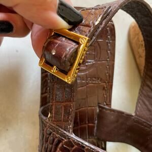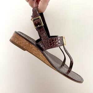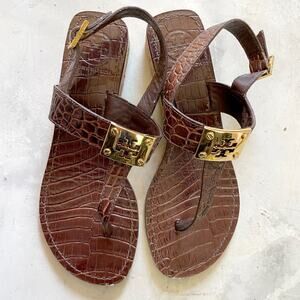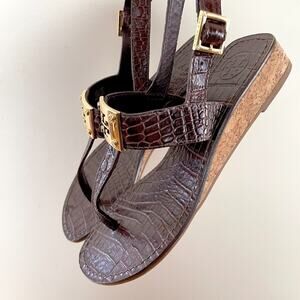 Tory Burch Brown Croc Leather Gold Logo Boho Preppy Sandals Wedge Heel Size 7