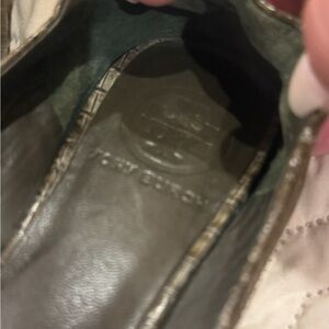 These Tory Burch flats feature a sophisticated brown crocodile texture and a gold-toned medallion on the toe, offering a chic and versatile style for any occasion. Size 7 Never worn; no box.
