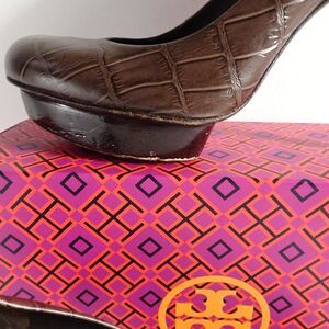 Tory Burch Brown Leather Faux Crock Platform Pumps Sz 6.5
