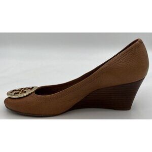 Tory Burch Brown Leather Sally Wedge Gold Logo Peep Toe Pump Women Size 10M