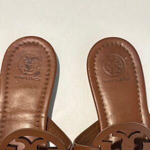 Experience the elegance of Tory Burch with these brown Miller sandals, featuring the signature circular medallion logo. Crafted from smooth leather, these slip-on sandals offer a minimalist aesthetic and a comfortable contoured footbed, perfect for versatile styling.