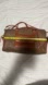 Stylish Tory Burch satchel with a brown monogram design. Features leather accents and a front pocket.