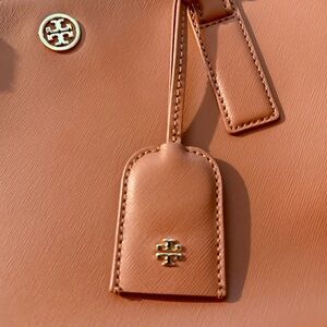 Elegant brown leather satchel with dual handles. Includes detachable strap for versatile use. Iconic Tory Burch logo detail.