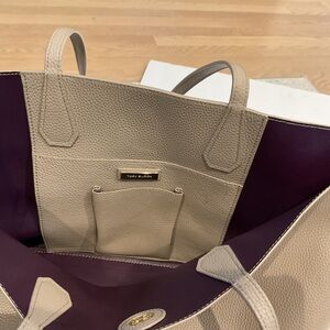 Elegant Tory Burch tote in brown. Perfect for everyday use. Worn one time. 19 inches wide 11 inches Tall. Great looking tote!