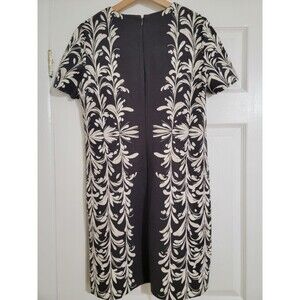 Very good used condition Tory Burch Brushstroke Symphony Mini Gray and Cream shift dress Size M. Back zip closure, raw edge sleeves and hem. 65% rayon 30% nylon 5% spandex.