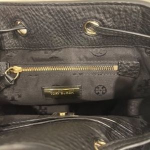 Hammered leather bucket bag featuring drawstring closure, detachable adjustable leather shoulder strap, logo plaque at side, branded fabric lining, two open pockets and one snap pocket.