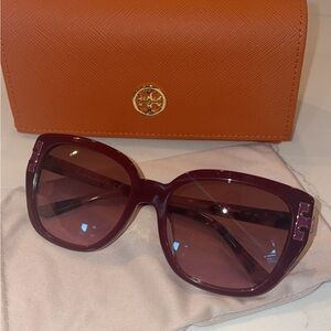 Stylish Tory Burch sunglasses with a rich burgundy frame. Perfect for adding a touch of elegance.
