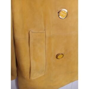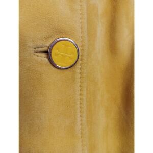 This beautiful jacket also comes with practical features such as pockets and is fully lined to keep you warm during the colder months. The yellow color, accented with beautiful buttons, will surely turn heads. Dry clean only. Tiny stain beside one of the buttons noted in picture.