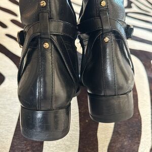 Tory Burch Calista Black Leather Tall Riding Boots Sz 10 Black Gold Logo Heel