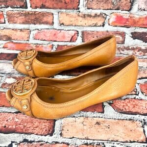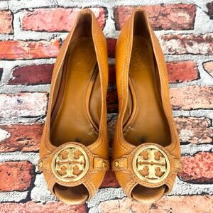 Tory Burch Camel Tan Selma Wedge Gold Logo Peep Toe Shoe Size 7.5 *PLEASE READ*