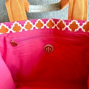 Stylish and vibrant, this Tory Burch tote bag features a striking pink and orange pattern. Perfect for the beach or traveling. This tote fits a 13” laptop and has two zippered pockets with Tory Burch logo detailing.