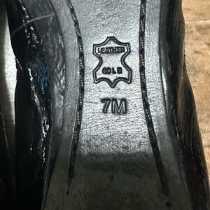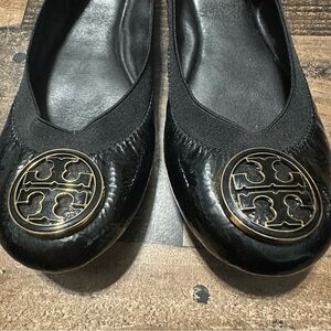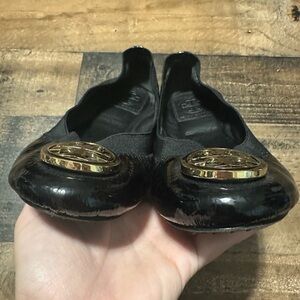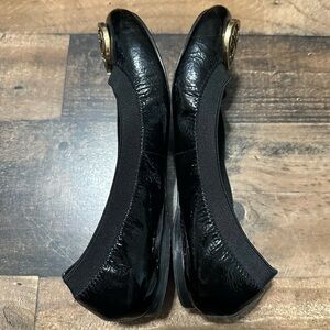 Excellent condition. Elegant black patent leather ballet flats featuring a stylish gold emblem. Perfect for adding a touch of sophistication to any outfit.