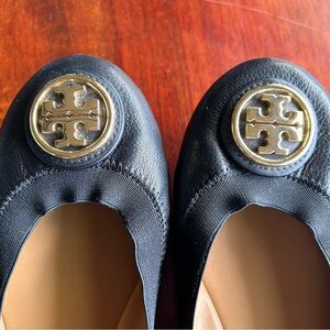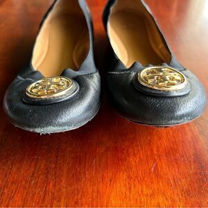 Tory Burch flats, ballet flats, black leather shoes, logo flats, Caroline 2, round toe, gold medallion, work shoes, classic flats, size 7