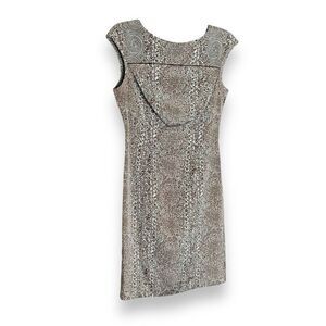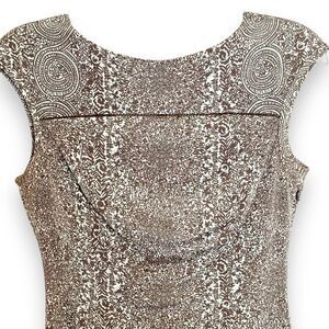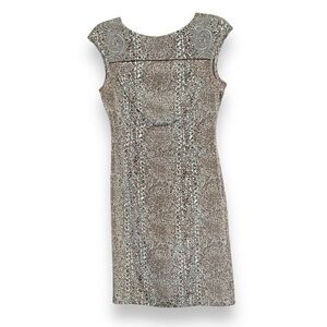 Features: An intricately printed A-line sheath extols femininity with a lovely boat neckline, cap sleeves and contrast-trimmed V-back. Hidden side-zip closure. Back vent. Fully lined. Triacetate/polyester; dry clean. Size: 2