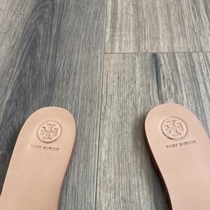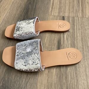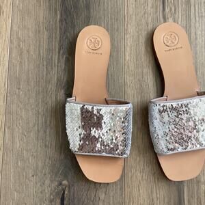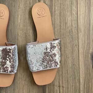 Tory Burch Carter Sequin Slide Sandal Silver Size 8.5 Leather Sole EUC