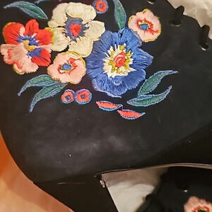Tory Burch Suede Ankle Lace-Up Boots Black & Blue Floral Print Semi-Pointed Toes with Embroidered Accent Concealed Zip Closure at Sides Includes Box 2.75" heel A little too big for me