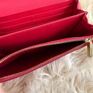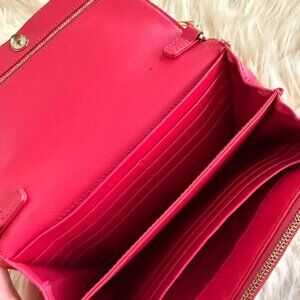 Elegant Tory Burch chain wallet crossbody crafted in a beautiful purple and pink premium leather. Item comes with a Tory Burch Dust bag. Features a flap with magnetic snap closure, a versatile chain-and-leather strap for shoulder or crossbody wear, and a spacious interior with multiple card slots, a zip pocket, and a bill compartment. Perfect for both day-to-day use and evening wear. The Cross Body strap can be removed to create a clutch look.