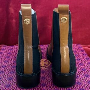Tory Burch Chelsea Boot--Sierra Antik in "Bonnie Brown/Perfect Black." Like new. I wore them out for a few hours to an event. Walked on pavement from car & back (please see last picture of the bottom--the sticker is still mostly on). Perfect neutral boot with Tan Brown & Black with a Black sole. Size 8.5.