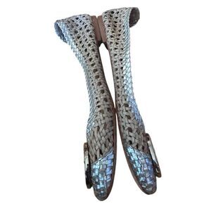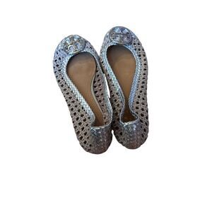 Tory Burch Chelsea Metallic Woven Leather Cap toe Flats in light taupe/silver 6