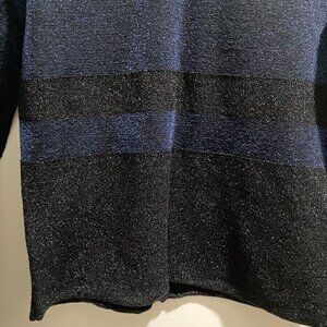 This Tory Burch sweater features a chic wool metallic striped design, making it perfect for both party and business occasions. The striped pattern, tight-knit style, rolled edge and crew neck neckline give it a classic and sophisticated look. Sweater has raw edge at the bottom and sleeves. Made from a blend of polyamide, metallic and wool, this pullover sweater is both stylish and comfortable, with features like stretch and breathability. The black/navy color and S/M size make it versatile for various seasons like winter, fall, and spring. Perfect for those who appreciate a mix of holiday, city, and gothic themes in their wardrobe. Excellent condition, size S/M. Measurements: pit to pit 17,5", sleeve 23,5" and length 22,5". Check my other listings.