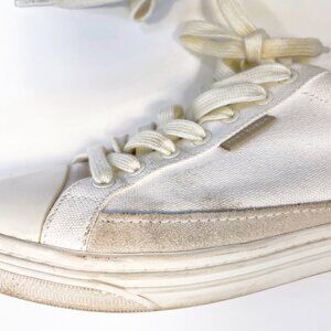 A classic remixed in contrast colors. Cotton canvas with a sporty cap toe. The Court sneaker is incredibly comfortable, with a padded collar, cushioned footbed and flexible rubber sole. The vintage-inspired lace-up is finished with our iconic Double T on the padded tongue, a signature tab and contrast channel stitching. It's great with denim, dresses and the season's relaxed suiting.