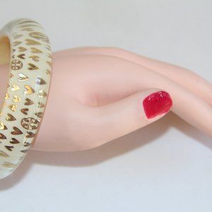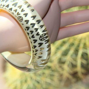 Tory Burch Clear, Ivory Lucite Gold Heart Logo Bangle. This Bold and Fabulous Bangle Makes a Glamorous Fashion Statement. Gold Hearts and Tory Burch Signature Logos on Ivory Lucite Show Through This Chunky Sleek and Smooth Bangle. Inside Circumference 8” x ¾” width. Substantial Elegant Weight 78grams/2.8 oz. Retail: $220.