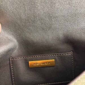 This sleek Tory Burch crossbody bag in classic black is crafted from a textured material, featuring a gold emblem for a touch of elegance. Its adjustable strap offers versatile carrying options, making it a stylish and practical choice for any occasion.