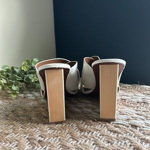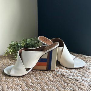 Women's Tory Burch Color Cube Mules. Ivory in color with color block heel measuring approx. 4". Size 9.5. Preloved and in great condition- please see photos for signs of wear on the bottoms.
