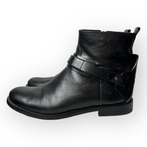 Tory Burch Colton Flat Bootie in Perfect Black. Made of Galleon leather. Gold-tone hardware, strap detail, embossed logo accent at the back. Inner side zip-up closure. Lightly padded leather insole and smooth man-made sole. Made in Brazil.