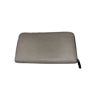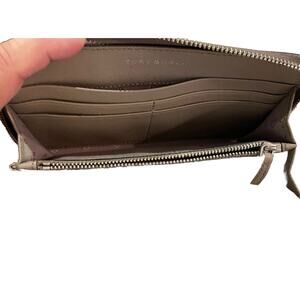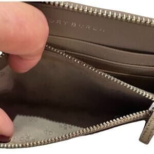 Tory Burch Continental Logo Wallet Zip Around French gray Goldtone Hardware . Eight credit cards slots for bill slots and a zippered change area preowned has flaws marking on front and back. Look at last photos.. inside is very clean preowned 7.5x4”