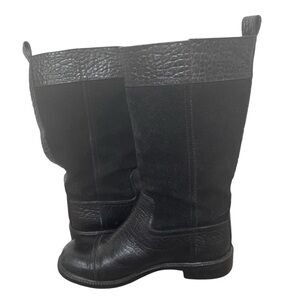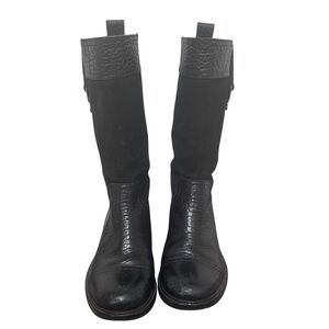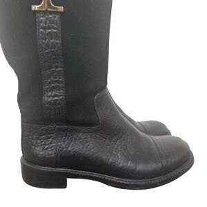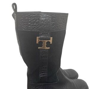 Absolutely gorgeous black leather mid calf boots from Tory Burch with textured leather, black suede, and the iconic gold logo on the sides.These are in good preowned condition; expected and normal wear on the soles, but the uppers are in gorgeous condition. Size 5.5M.