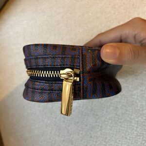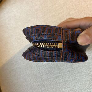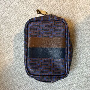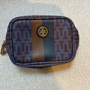 Tory Burch Cosmetic Bag Brown Blue Leather T Logo Print Small Gold Zipper Preppy
