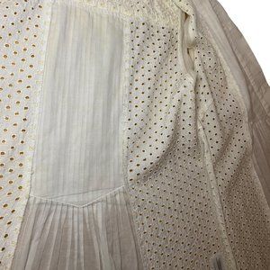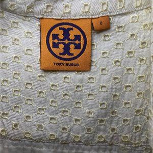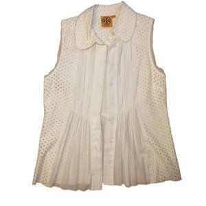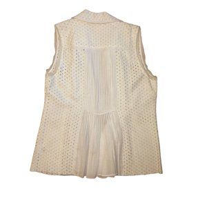 This Tory Burch cream/beige sleeveless eyelet top has beautiful details: front panel pleating, eyelet/perforated sides and collar, with raw edge sleeves.