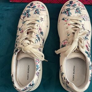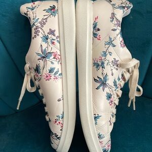 Stylish cream sneakers with floral design. Perfect for casual wear. Comfortable and chic.