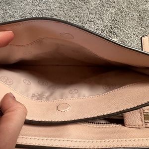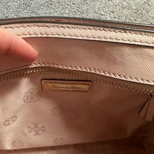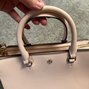Elegant cream satchel with top handles. Features a detachable strap. Iconic Tory Burch logo on front. Good condition!