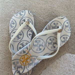 Elegant Tory Burch sandals with signature logo design. Cream straps and gray patterned sole. Ideal for casual wear.