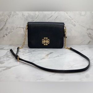Black pebbled leather Tory Burch crossbody bag. Strap is removable to use as a large clutch instead. 2 large pockets and one small zipper pocket.
